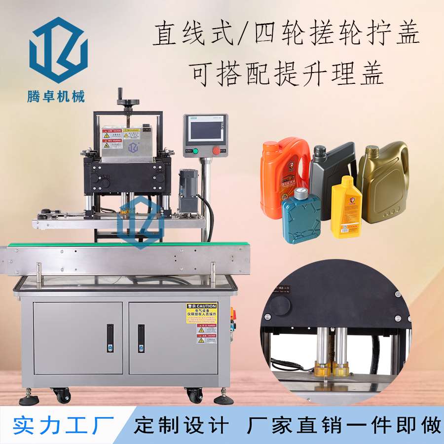 本機(jī)主要適用于螺絲紋平頭塑料蓋旋蓋擰緊,例:潤滑油桶、礦泉水瓶、藥瓶、日化用品、飲料瓶等。調(diào)節(jié)簡單,使用方便??杉嫒荻喾N瓶子蓋子。
